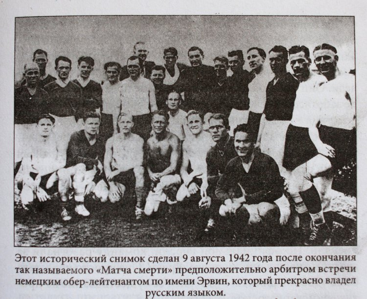 This photograph features FC Start consisting of players from the Ukrainian football clubs, Dynamo Kiev and Lokomotiv Kiev. The 1952 Death Match featured the Nazi-backed star-studded German national team called Falkelf and Ukrainian prisoners of war, erstwhile footballers, called FC Start. It was a tremendous blow to the Nazi prestige that these bunch of malnourished prisoners went on to hammer the heck out of Flakelf, at every match and re-match.